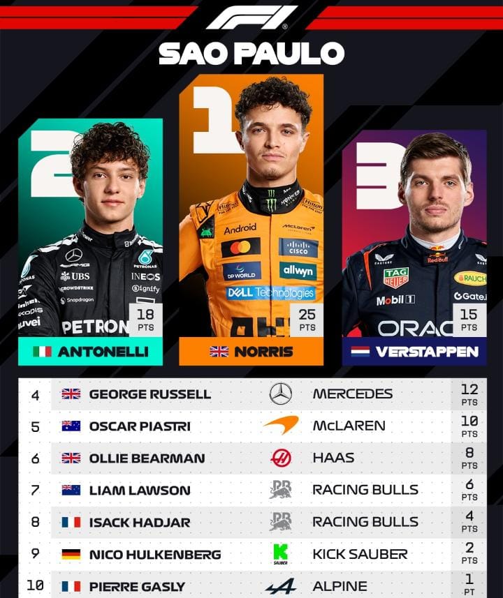 Lando Norris (McLaren) arrasó con todo en Interlagos. Ganó todo, sumo fuerte y sueña con el título. Mostrando un gran potencial en el McLaren para intentar definir el certamen en su favor.