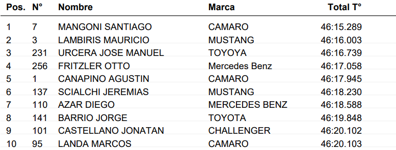 Segundo finalizo Mauricio Lambiris con el Ford Mustang, y en el tercer lugar termino José Manuel Urcera con el Toyota Camry.