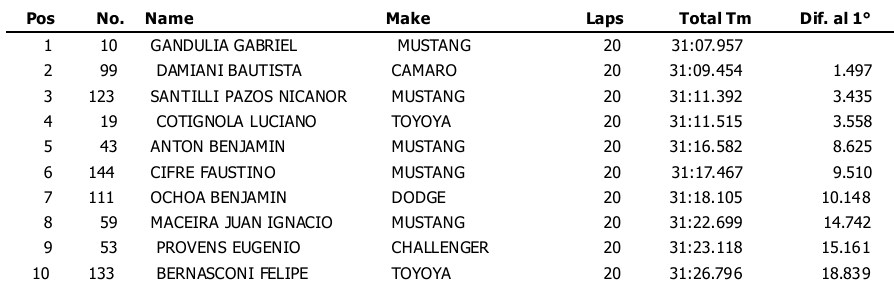 Segundo finalizo Bautista Damiani con el Chevrolet Camaro y en el tercer lugar termino Nicaror Santilli Pazos con el Ford Mustang.