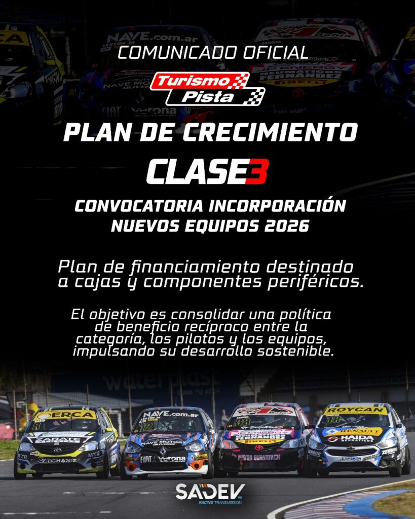 La Asociación Pilotos Turismo Pista informa que, en el marco de su Plan de Crecimiento 2026, se encuentra abierta la convocatoria para nuevos equipos interesados en incorporarse a la Clase Tres, ofreciendo un plan de financiamiento destinado a cajas y componentes periféricos, bajo el compromiso de asistencia perfecta durante todo el calendario deportivo.